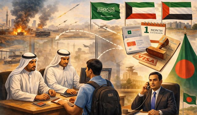 ইরানে আমেরিকা যুক্তরাষ্ট্র ও ইসরায়েলের যৌথ আক্রমণের কারণে যুদ্ধ পরিস্থিতিতে মধ্যপ্রাচ্যের বিভিন্ন দেশ থেকে বাংলাদেশে ছুটিতে আসা প্রবাসী কর্মীদের ভিসার মেয়াদ শেষ হওয়া নিয়ে সৃষ্ট জটিলতা নিরসনে বাংলাদেশ সরকার সর্বোচ্চ কাজ করছে বলে এক গণবিজ্ঞপ্তিতে জানিয়েছে প্রবাসী কল্যাণ ও বৈদেশিক কর্মসংস্থান মন্ত্রণালয়।