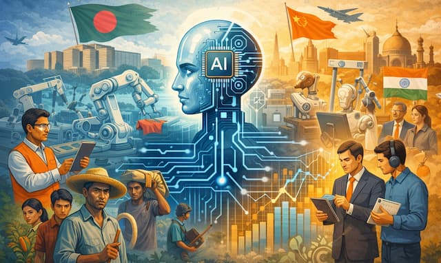 ভূরাজনৈতিক দিক থেকেও বাংলাদেশ একটি গুরুত্বপূর্ণ সন্ধিক্ষণে রয়েছে। চীন ও ভারতের মাঝামাঝি অবস্থান এই অঞ্চলকে আগামী দশকে এআই বিনিয়োগ ও প্রযুক্তি প্রতিযোগিতার নতুন মানচিত্রে পরিণত করতে পারে। চীন এআইনির্ভর উৎপাদনে দ্রুত এগোচ্ছে, আর ভারত বলছে “এআই ফর অল”। বাংলাদেশ যদি নিজস্ব প্রযুক্তি রোডম্যাপ ও কৌশল নির্ধারণে পিছিয়ে থাকে, তবে আঞ্চলিক প্রতিযোগিতায় পিছিয়ে পড়ার ঝুঁকি প্রবল।